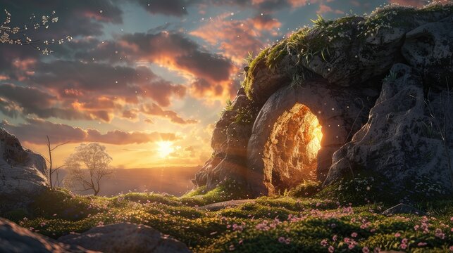 Stone is rolled away from empty grave on Easter morning. Jesus Christ resurrection. Empty tomb of Jesus with light. Born to Die, Born to Rise. He is not here he is risen . Christian Easter concept.