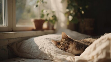 Woman sleeping peacefully on comfortable bed in cozy bedroom