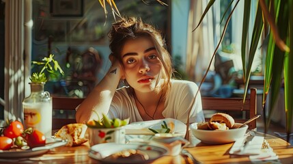 Young woman resting her head on her hand at a breakfast table