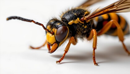 This is a photograph of a large bee with iridescent wings, standing upright against a plain background. The bee has dark stripes and a light yellow head.