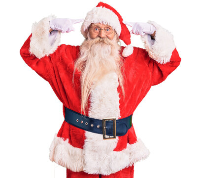 Old senior man with grey hair and long beard wearing traditional santa claus costume smiling pointing to head with both hands finger, great idea or thought, good memory