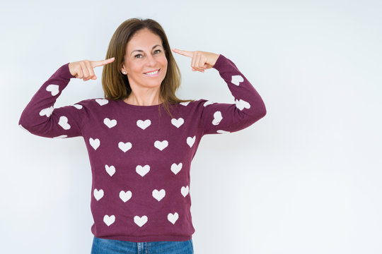 Beautiful middle age woman wearing heart sweater over isolated background Smiling pointing to head with both hands finger, great idea or thought, good memory