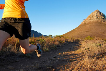 A woman running from Lion's Head to Signal Hill above the city of Cape Town just after sunrise. Cape Town, South Africa.