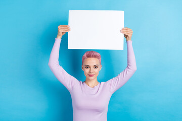 Photo of satisfied person with short haircut wear stylish sweatshirt arms holding placard over head isolated on blue color background