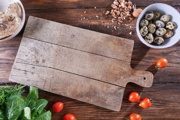 Wooden board on the kitchen table around boiled quail eggs in a bowl, pieces of nuts, tomatoes, meat and greens. Copy space. Ingredients for Healthy Salad. Flat lay