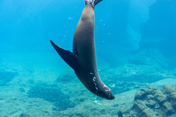 Playful fur seal dives gracefully headfirst in deep blue water tank at the zoo. Concept of marine mammals, animal agility, and wildlife in captivity.