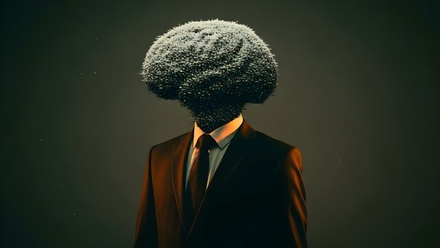 Headless figure in suit with glasses stands against gray background arms crossed.