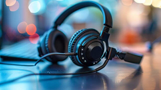 A pair of headphones sits on a desk next to a laptop