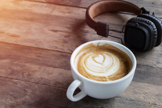 Cozy winter background, cup of hot coffee with marshmallow and headphone music, warm knitted sweater, vintage tone. Lifestyle and music concept.
