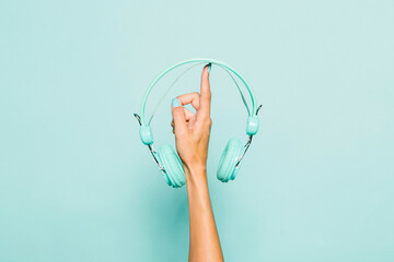 Hand holding blue headphones
