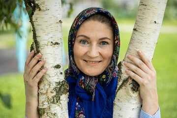 Close up portrait of a senior woman wearing a yellow headscarf in a garden.
