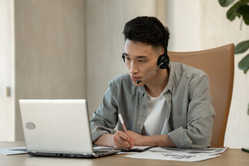 Man with headset and laptop talking using video call, support service worker at workplace inside office. Advises customers consumers. Business meeting remote conference.