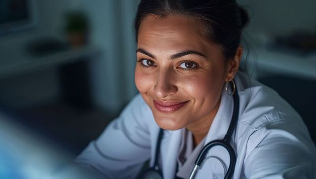 Warm female physician making gentle eye contact wearing white coat and stethoscope