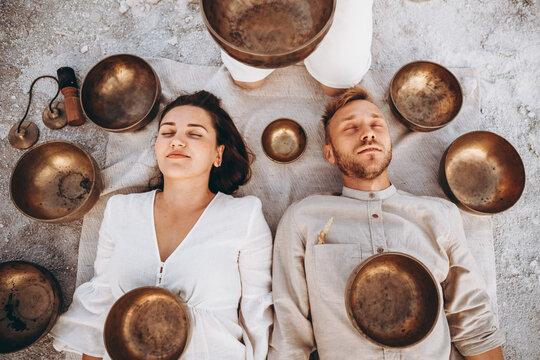 group therapy with Tibetan singing bowls for a girl and a boy lying on the ground in the middle of the desert surrounded by copper bowls, meditation and relaxation