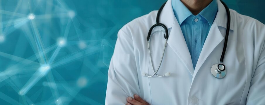 Healthcare professional holding stethoscope with holographic privacy locks and digital health networ