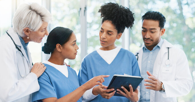 Doctors, nurses and tablet in hospital for planning, healthcare and digital lab results of patient. Medical team, diversity and tech in clinic for health meeting, collaboration or research with video