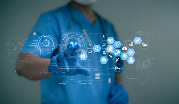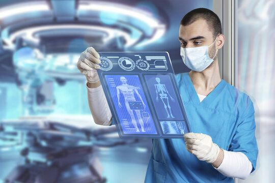 Doctor surgeon in medical apparel working with Futuristic Holographic Interface, showing medical Data in augmented reality from artificial intelligence AI.