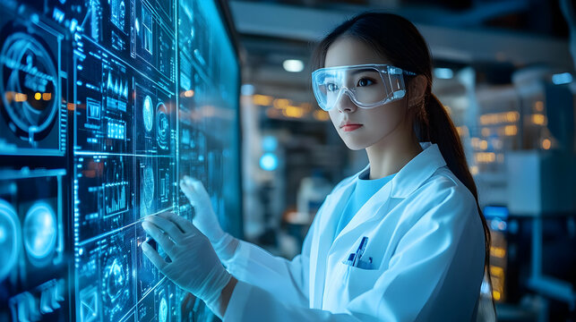 A woman in a lab coat observes digital data on a screen.