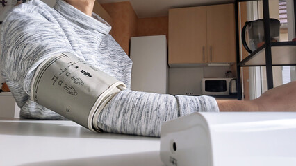 Smiling senior man independently measures his blood pressure at home using a digital tonometer. Concept for elderly healthcare, cardiovascular health check, and proactive self-care.