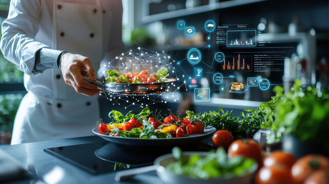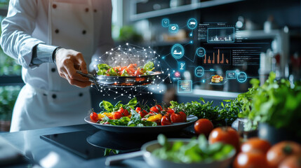 chef using futuristic food preparation system in modern restaurant kitchen, showcasing vibrant vegetables and digital data overlays