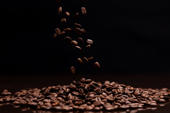 High contrast image of coffee beans being dropped onto pile with
