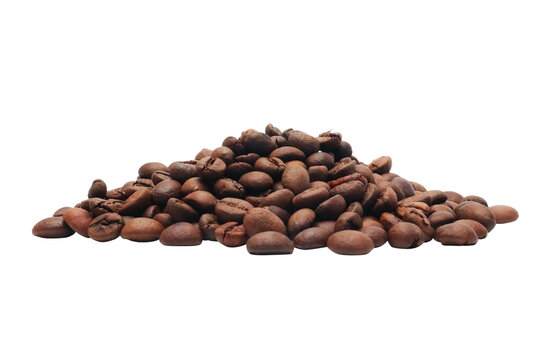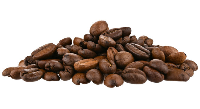 Pile roasted coffee beans isolated on a transparent background. Completely in focus.