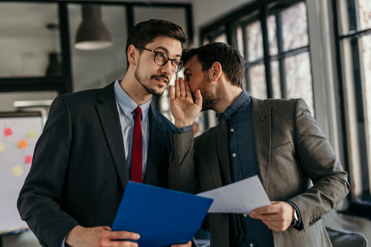 Businessmen whispering and sharing confidential information in office