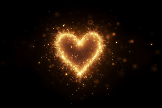 A heart made of light and gold sparkles in the dark. The heart is surrounded by a stream of glittering particles, creating a dreamy, ethereal atmosphere. Concept of warmth, love, and magic