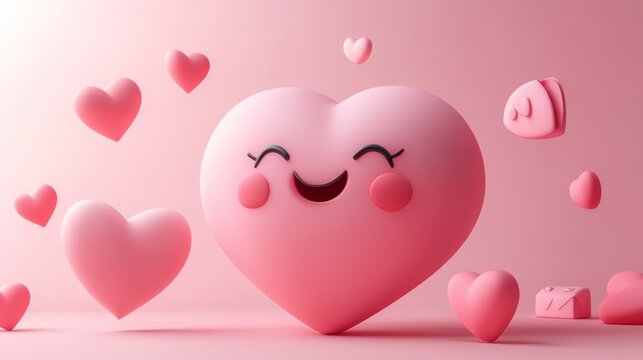 Cute pink heart emoji, floating hearts, cheerful expression, 3d rendering, love,