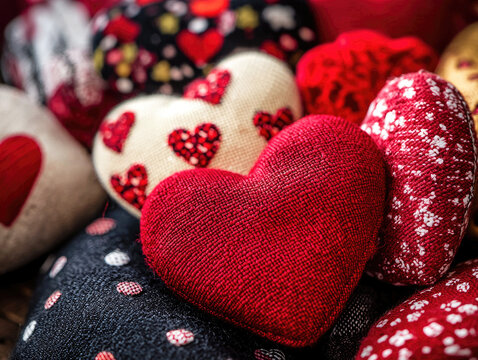 Red Velvet Heart Collection: A captivating close-up of a cluster of handmade hearts in various textures, colors, and patterns, showcasing a rich red velvet heart as the focal point.