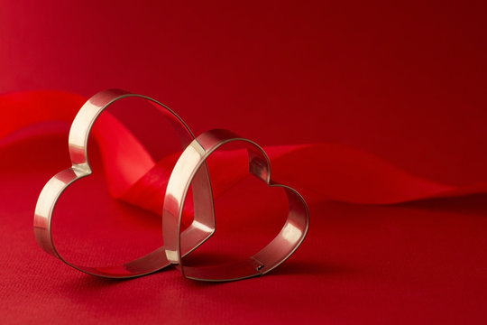 two heart shaped cookie cutters on wooden board