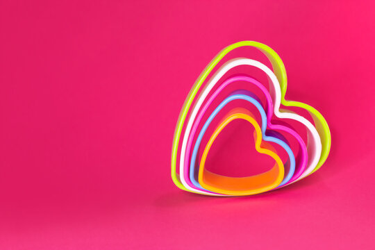Multicolored heart shaped cookie cutters on a pink background