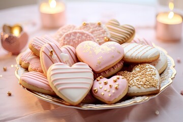 Pink, soft colored cookies in heart shape. Cookies with sugar icing in pastel colors in a plate. Delicious pastry. Candles, lights in the background. Soft romantic lighting for passion and love,