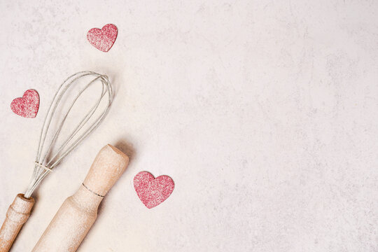 Valentine's Day Baking background. pink Hearts with rolling pin, copy space