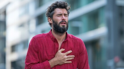 A bearded businessman in a red shirt walking on the street near an office building, suddenly experiencing a sharp pain in his chest from a heart attack. He looks distressed, holding his chest, with a