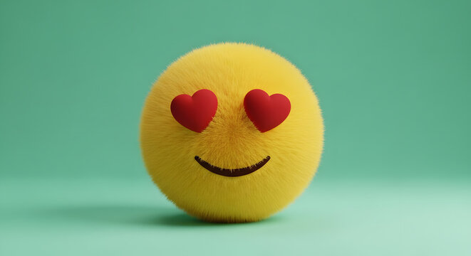A vibrant, three dimensional emoji radiating joy and affection, its face adorned with luminous heart shaped eyes that shimmer with a kaleidoscope of warm, iridescent hues