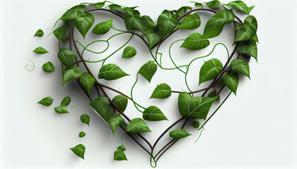 Twisted jungle vines liana plant with heart shaped young green leaves isolated on white background,  heart shape made of leaves, Ai generated image