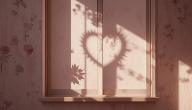 Small wooden house with white heart outlines floating above on a soft pink background with blurred curtains