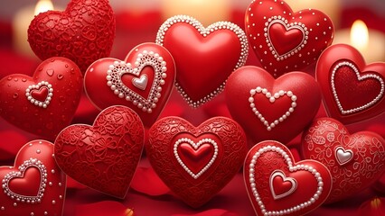 Glowing golden heart outlines shimmer across a deep red background creating a magical and romantic atmosphere perfect for valentines celebrations or anniversary graphics