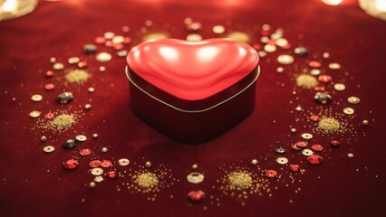 illuminated red heart-shaped box surrounded by glitter and confetti on a rich red velvet surface