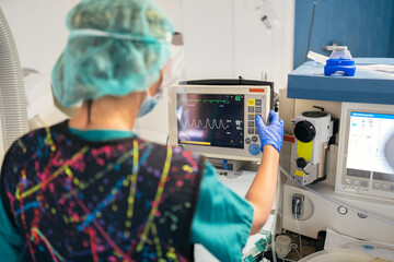 EKG monitor in intra aortic balloon pump machine in icu on blur background, Brain waves in electroencephalogram, heart rate wave