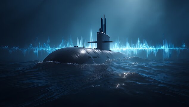 A submarine is sailing through dark waters with a sonar pulse behind it