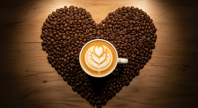 A steaming cup of coffee with a heart shaped latte art design sits on a rustic wooden surface. Coffee beans are scattered around the cup, creating a warm and inviting scene.