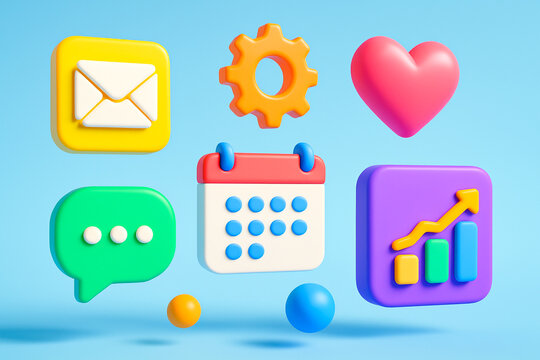 3D message box with gear, love icon, date calendar, and analytic chart symbol representing digital communication, data, and connection
