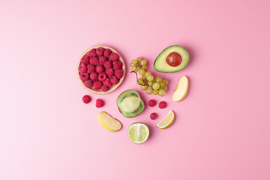 Fresh fruits and vegetables on pink background. Healthy eating concept. Flat lay, copy space.