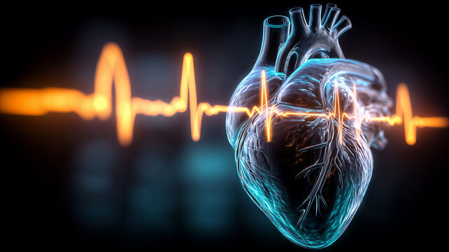 Transparent anatomical heart with glowing ECG waveform representing cardiac monitoring, medical diagnostics and digital healthcare innovation.