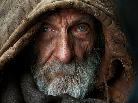 A heartbreaking portrait of an elderly homeless person sitting on a city street, looking destitute and begging for help, conveying a sense of loneliness and vulnerability.