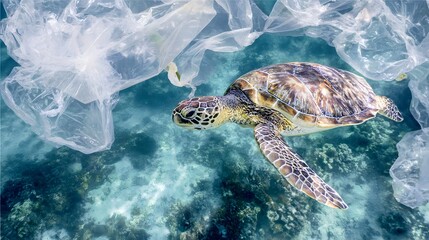 Sea turtle in plastic tangle, crystal-clear waters, heartbreaking beauty