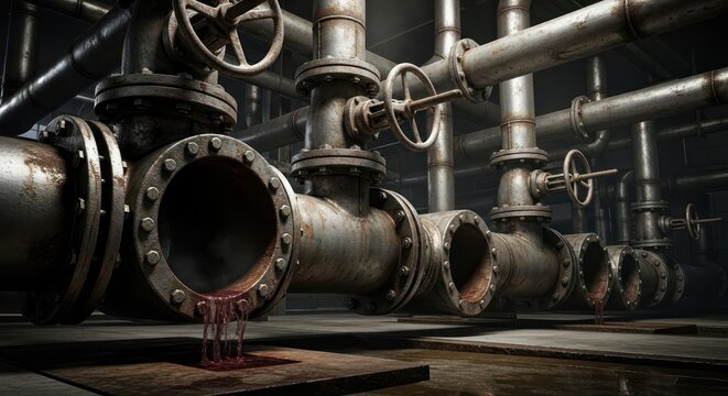 Industrial heartland intricate system of aged pipes with valves creating a surreal scene