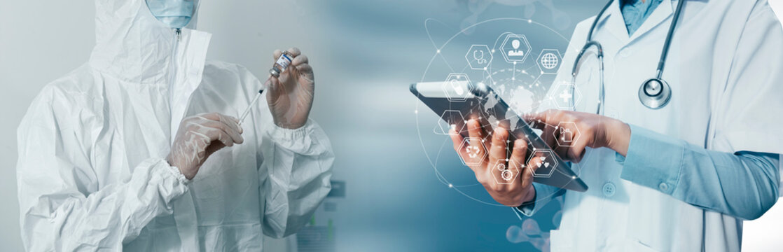 Medicine doctor using digital healthcare and network connection on hologram modern virtual screen interface icons, Medical technology futuristic concept.